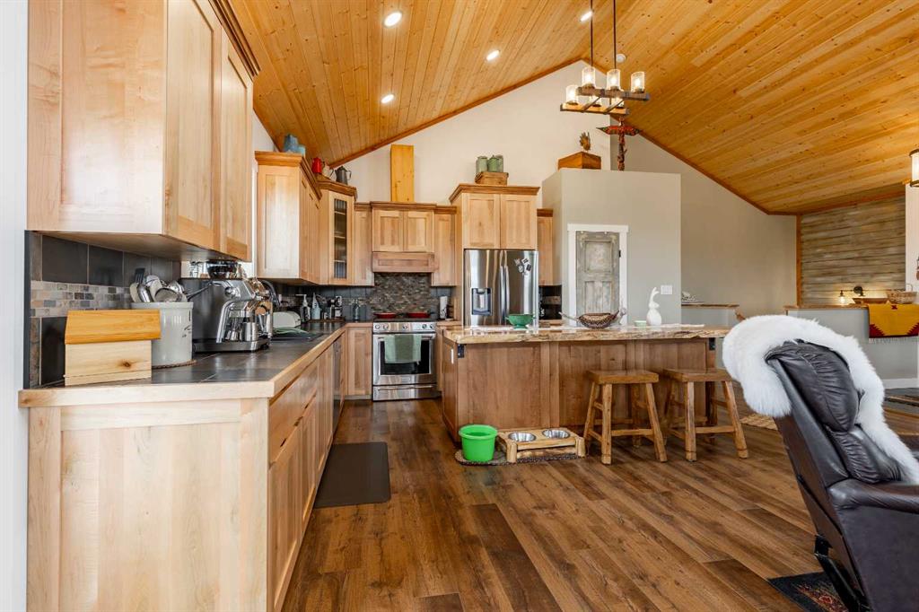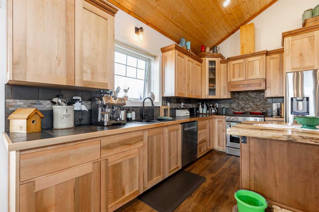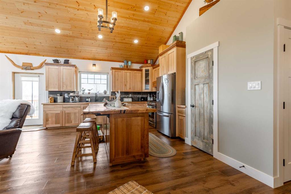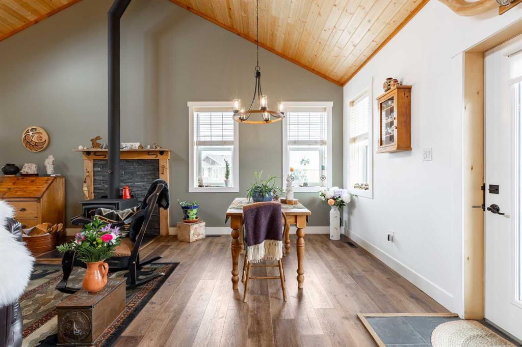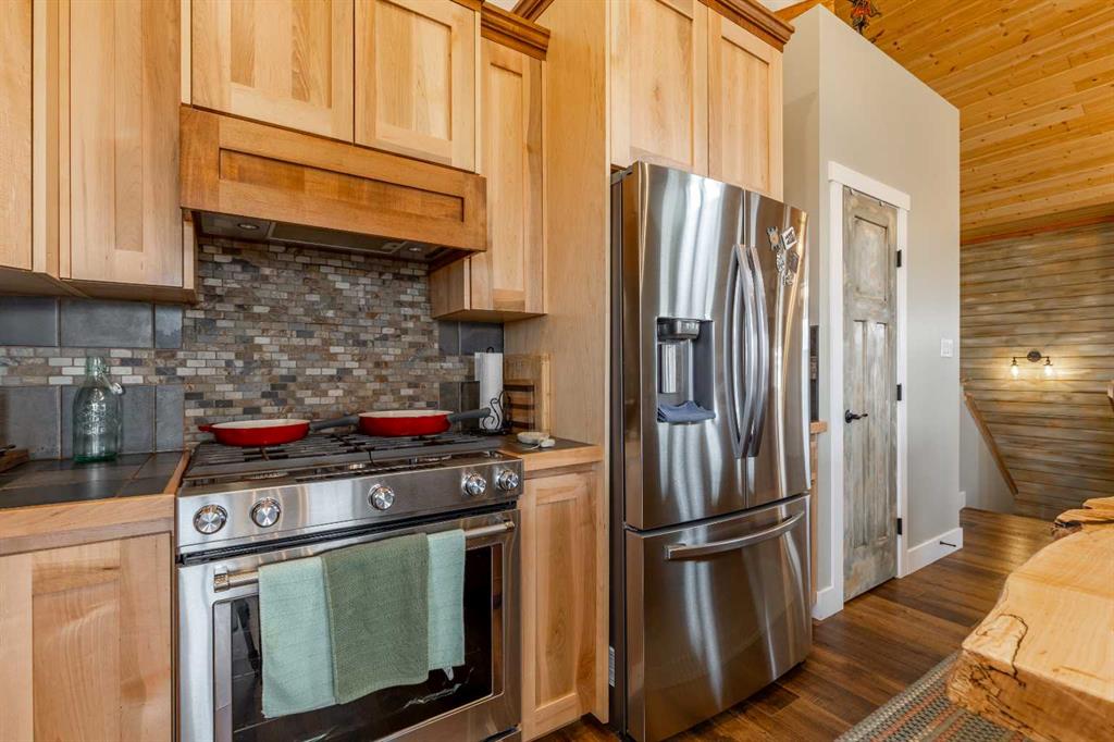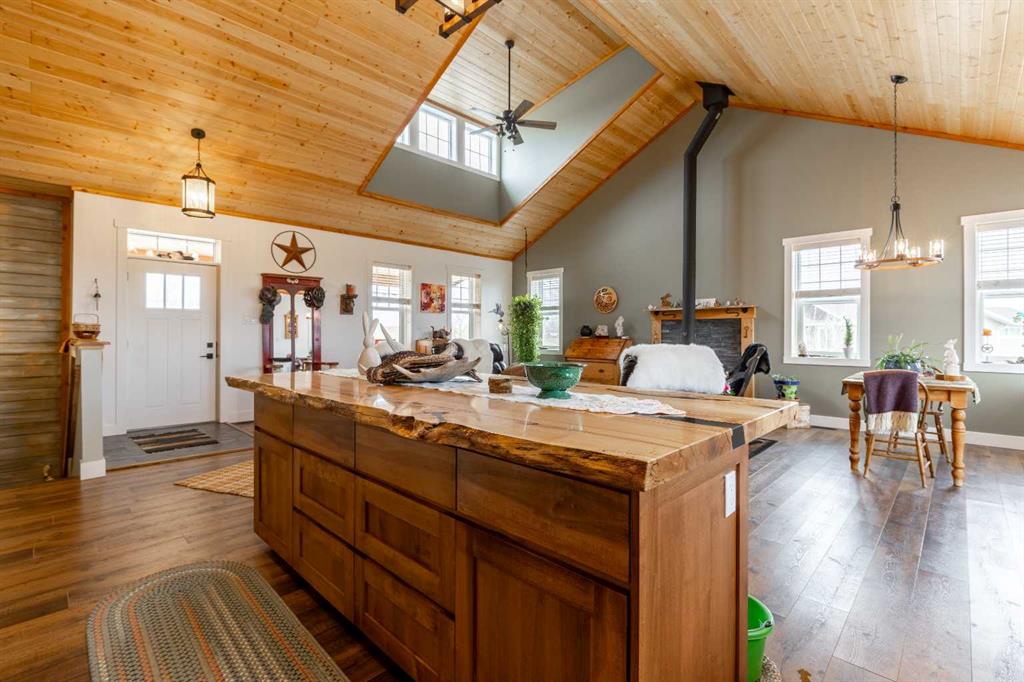 A cozy front porch wrapped in cedar planking welcomes you inside, where vaulted ceilings and an open-concept living, dining, and kitchen area create an immediate sense of space. The home is highlighted by an energy-efficient wood-burning stove, an 8′ live-edge maple slab island, and beautiful views to the backyard. The kitchen features custom lighting, a gas range, and high-end stainless-steel appliances.